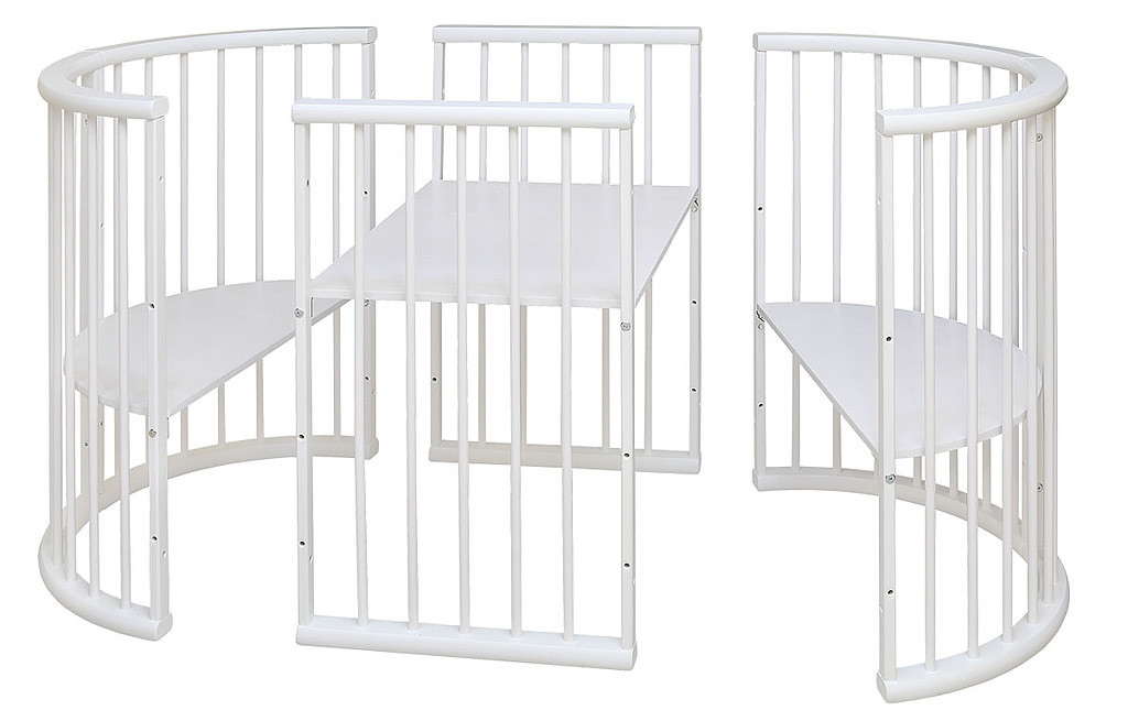 Кровать состоит из 3-х частей, которые могут использоваться как по отдельности, так и вместе. Боковые части могут использоваться в качестве спального места для ребенка (1 боковая часть - приставка к кровати родителей, 2 боковые части, соединенные вместе - кроватка-люлька), а также в качестве диванчика/столика для игр. Центральная часть может использоваться в качестве столика. Все части, соединенные вместе, могут использоваться в качестве кроватки для ребенка до 3-х лет, а также в качестве манежа (нижнее положение основания под матрац).