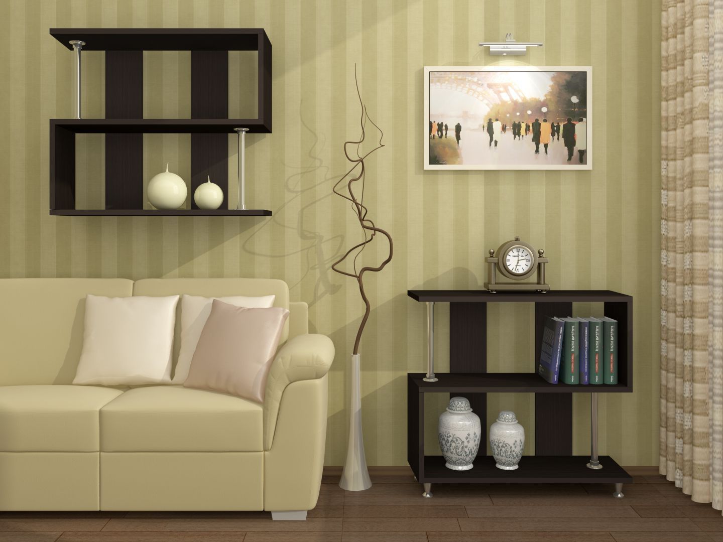 Элегантный и стильный стеллаж мини можно установить на пол (ножки прилагаются и входят в комплект поставки) или прикрепить на стену в виде книжной полки. Мебельные модули смотрятся свежо и по-современному благодаря сочетанию ЛДСП и штанг из хромированного металла. Открытость конструкции, отсутствие глухой задней стенки создает ощущение легкости и воздушности.